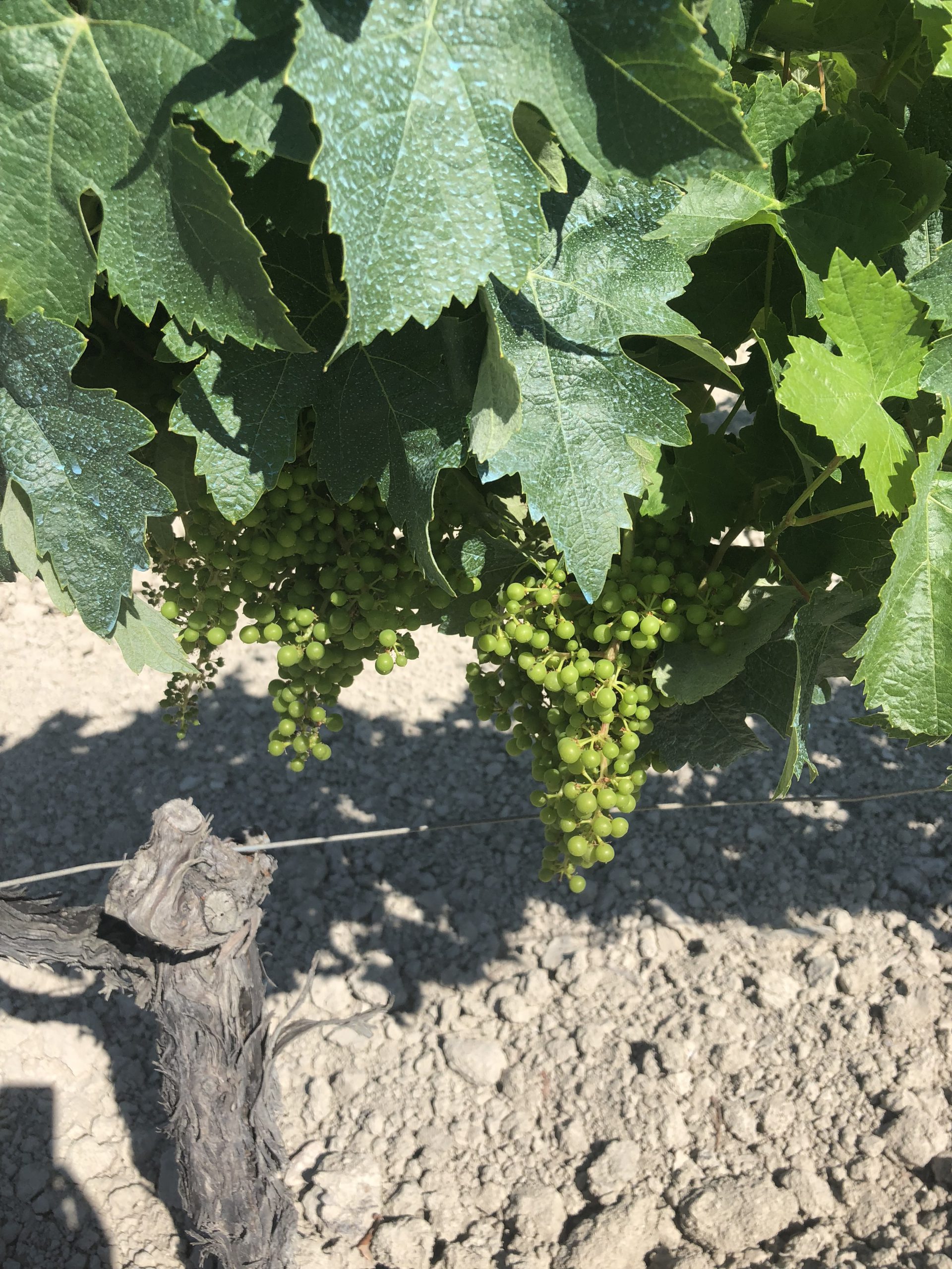 We then spent some time examining the palomino vines and developing grape clusters, which looked like small green peas. They had finished bloom, and I was surprised to see how long the clusters were. The vines appeared very healthy and were planted on 8 feet by 6 feet spacing using VSP trellis. Fermin explained that they use sulfur, copper, and sexual confusion traps to maintain the health of the vineyard. All pruning is done by hand, there is no irrigation, and they machine harvest around 80% of the vines.