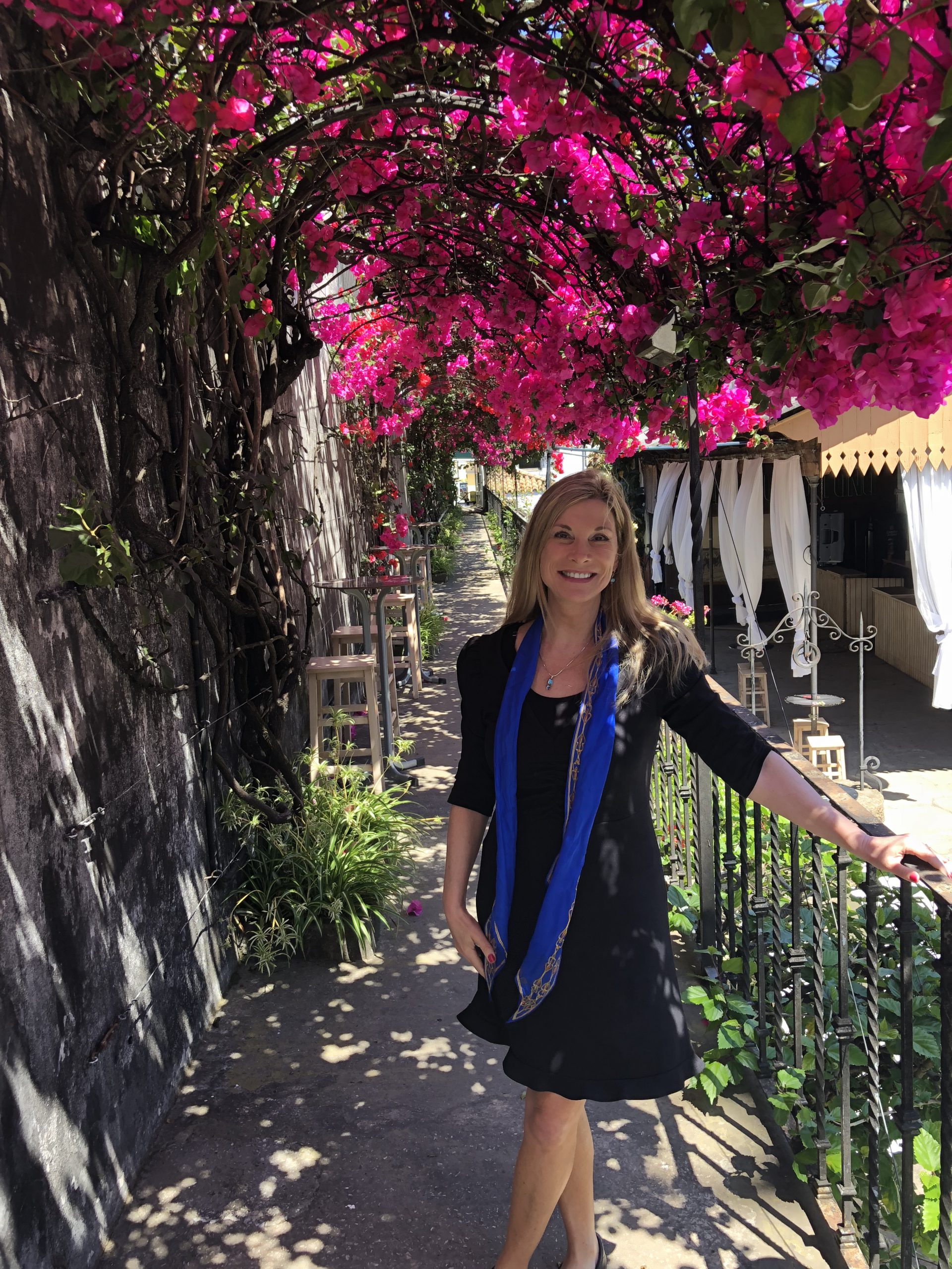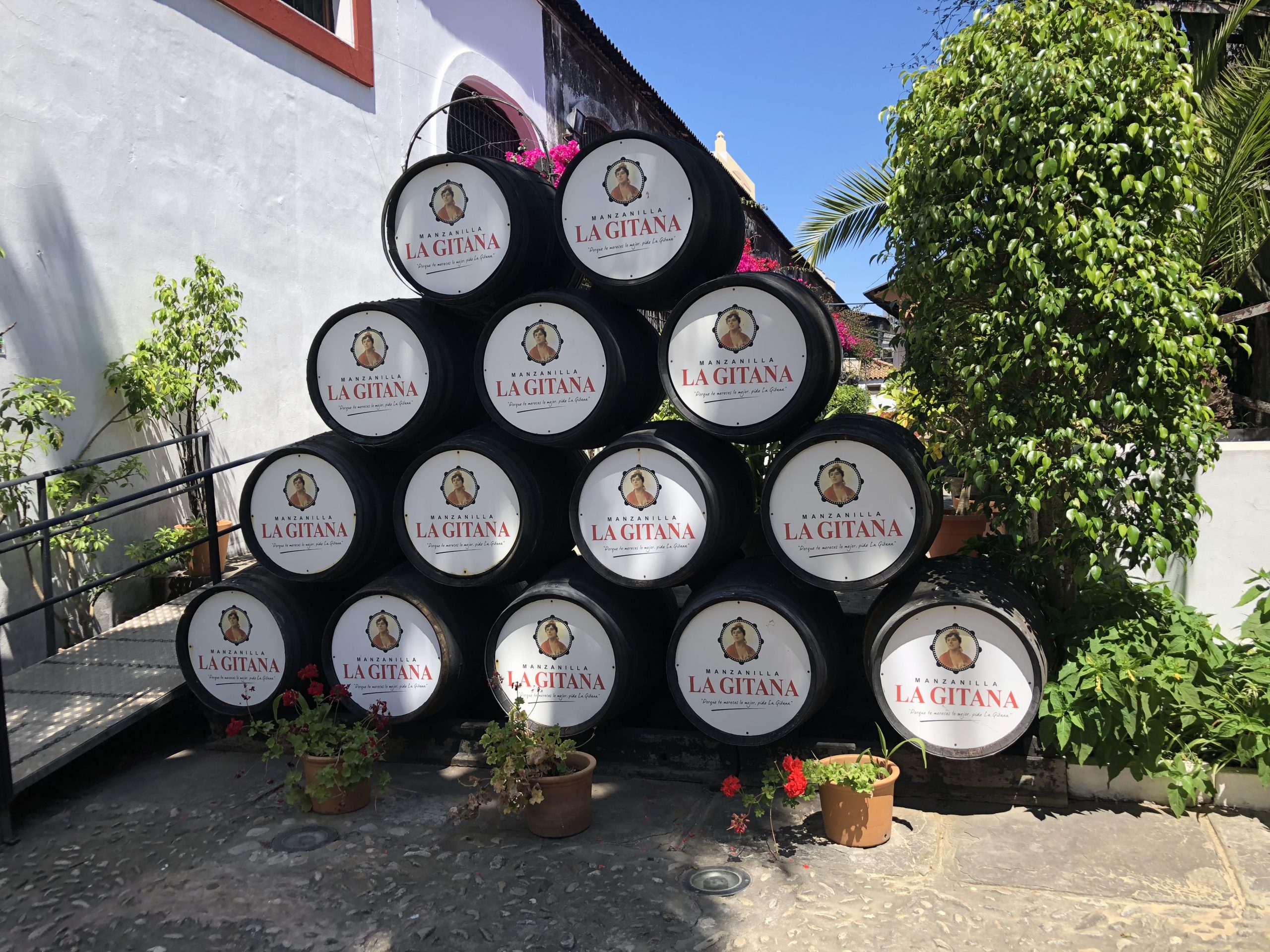 We toured the solera cellars, and I was impressed with the beauty of the architecture, the old black barrels, towering support columns, and high ceilings. There were tree shaded courtyards and bountiful pink bougainvillea tumbling down the walls around the winery.
