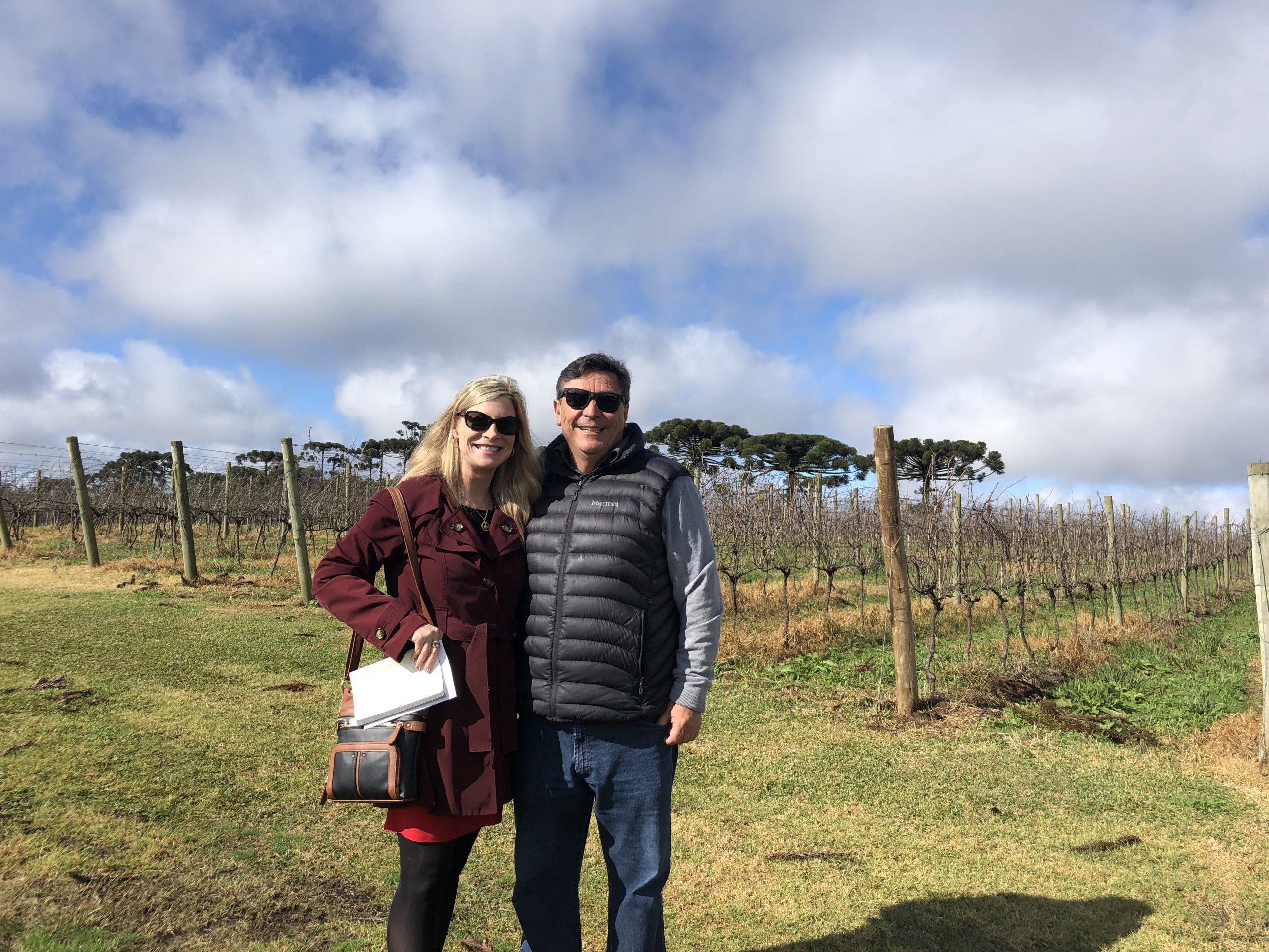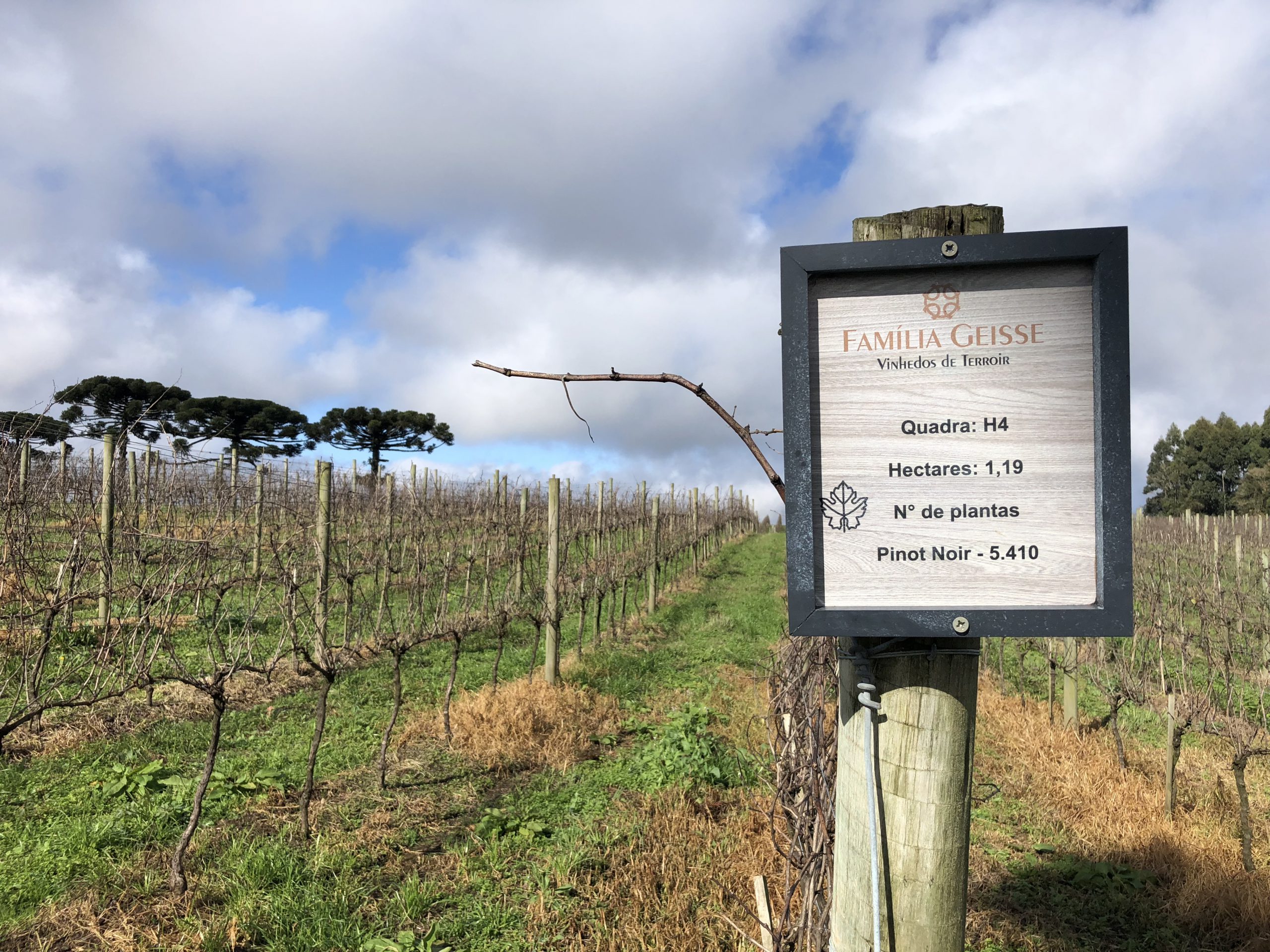Since the vineyard is the source of all high-quality wine, Carlos invited us to jump into his four-wheel drive SUV and we set off driving along a bumpy dirt road into the vineyards. Because June is winter time in Brazil, the vines were bare of leaves and stretched out in long perfect rows, attached to a VSP trellis system with verdant green grass growing beneath. As he drove, Carlos explained that the estate was 70 hectares, with 25 hectares of vineyards, situated at 800 meters above sea level (2400 feet). They produce around 300,000 bottles per year, with 50% as vintage wine. The soil is primarily loam on top with basalt bedrock.