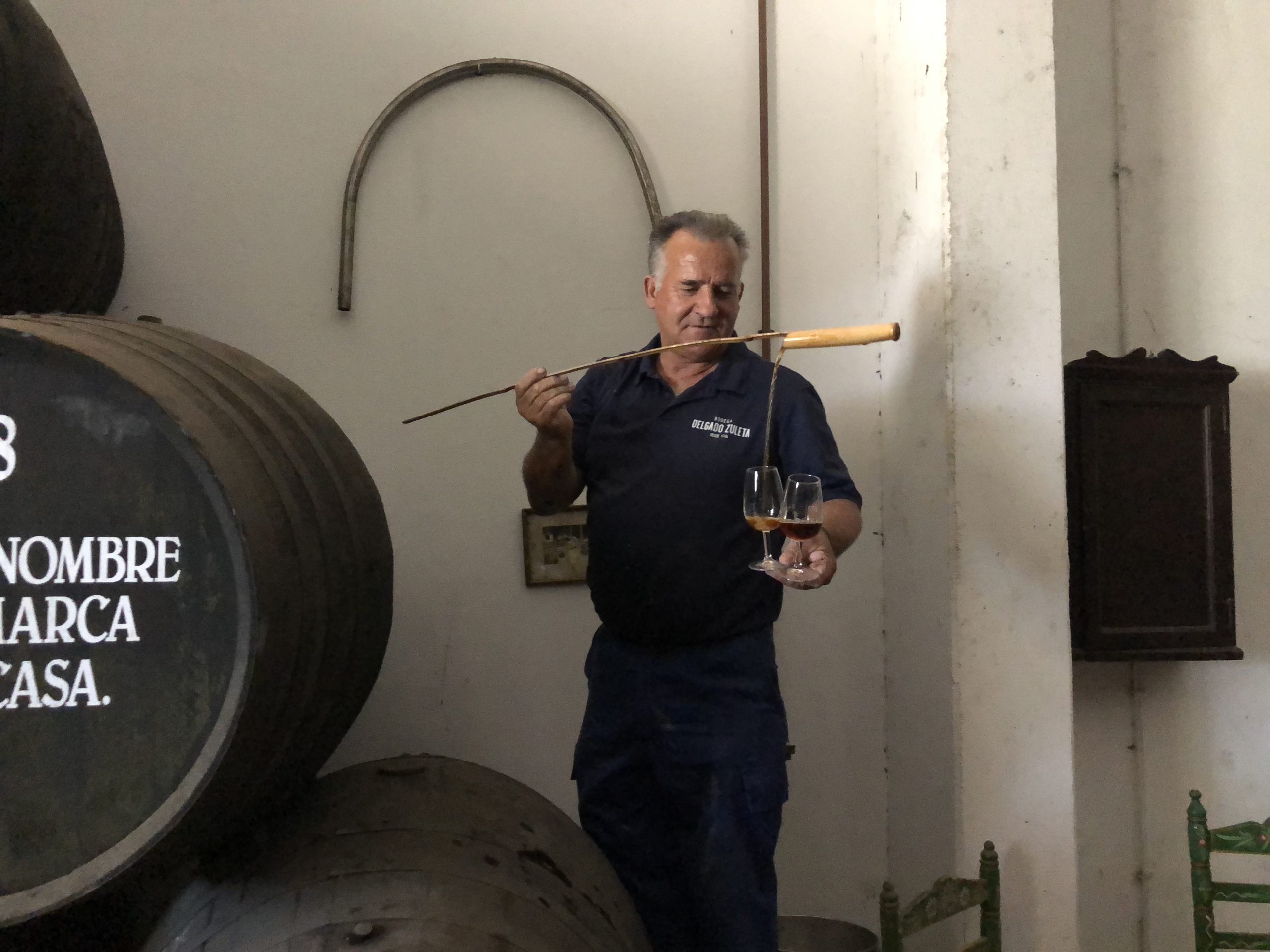 Eva explained that this unique stack of black sherry barrels held the private reserve wines of the Zuleta family. I watched as the cooper unlocked several barrels, and then using a llenenzia, he deftly subtracted some sherry and poured it into wine glasses. We were allowed to taste an amontillado and cream sherry from these ancient casks. The cream sherry was especially delicious with Pedro Ximenez grapes added to the blend.