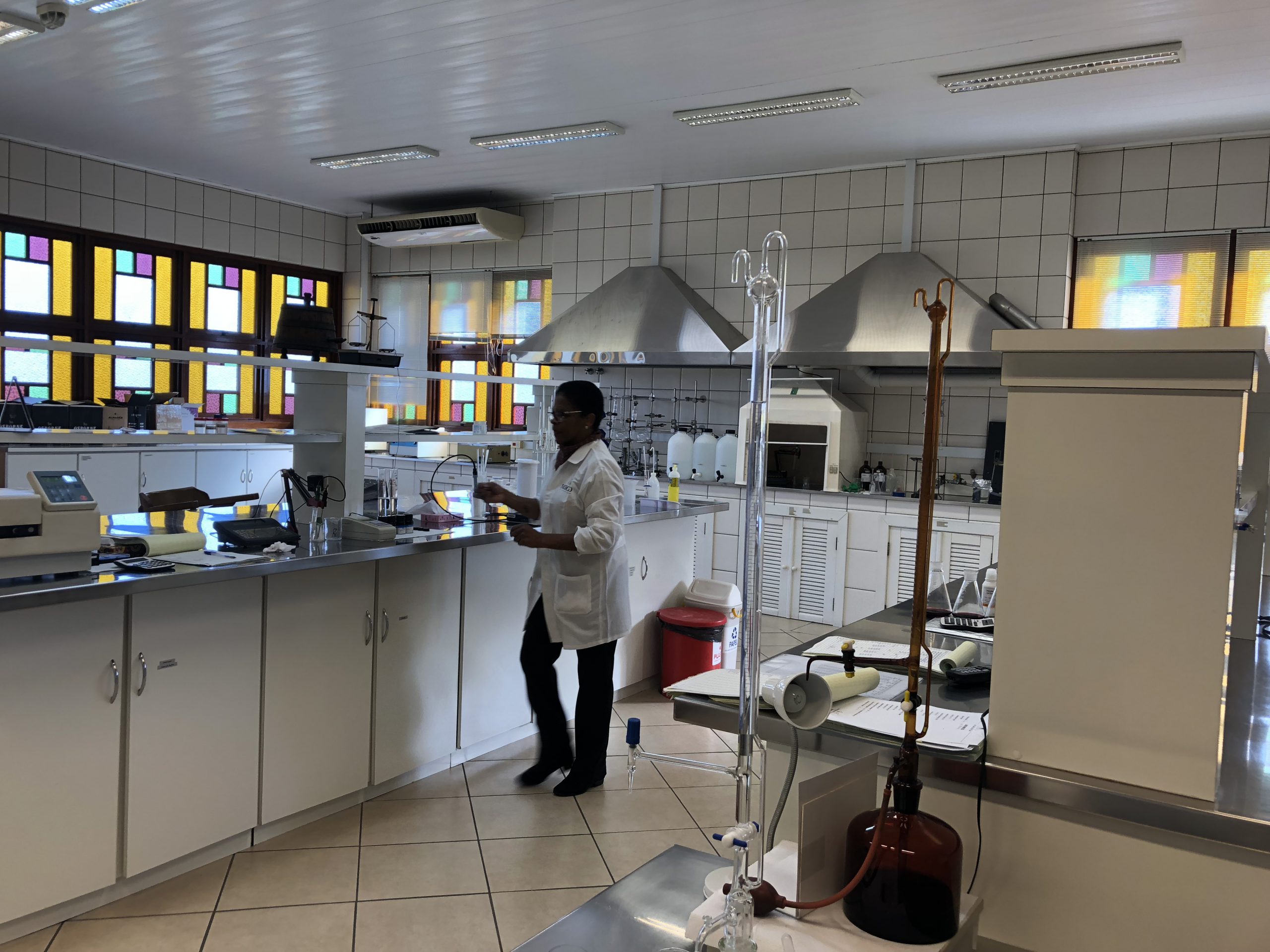Due to its large size, the winemaking facilities at Miolo are quite expansive. We donned protective clothing, including head covers and smocks for the tour, but I don’t think we would have won any fashion competitions (see photo). I was especially impressed with the size of the laboratory, where we met one of the enologists.